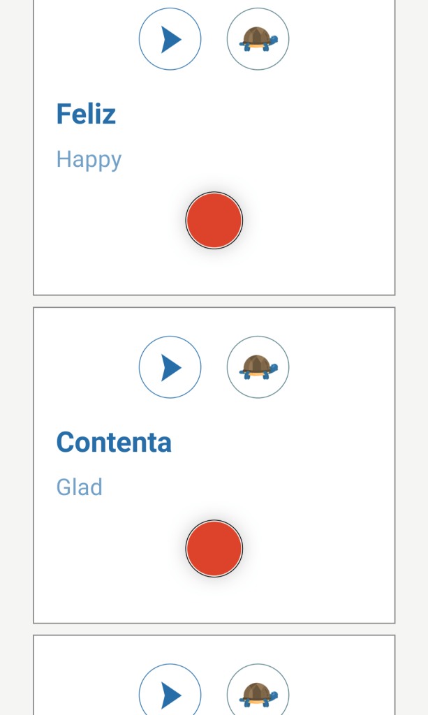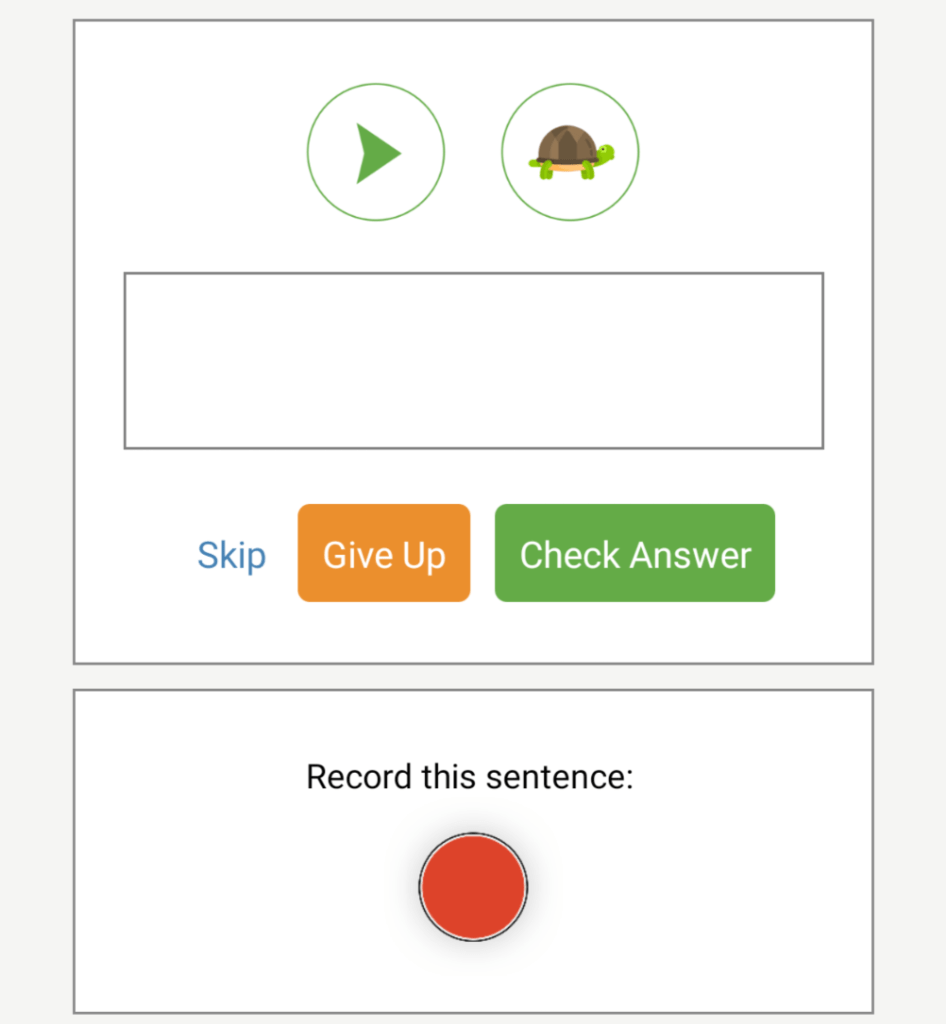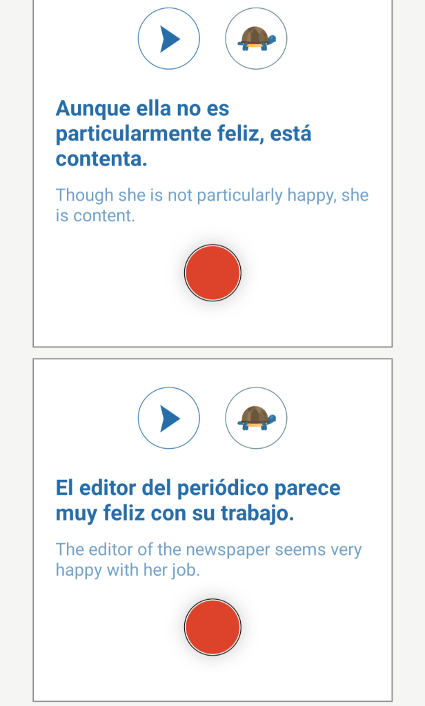 With Speechling’s flashcards, you get to learn new words/phrases with two different audio tracks (these are with a male voice and a female voice), and repeat it back.