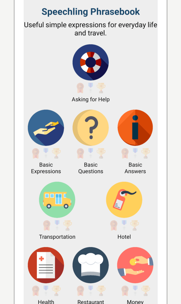 While the “Toolbox” tab provides you with a variety of different ways to use and express yourself using the sentences and phrases that Speechling has, the “Skills” tab is where you find those words and sentences and phrases, organized by skill level and category.