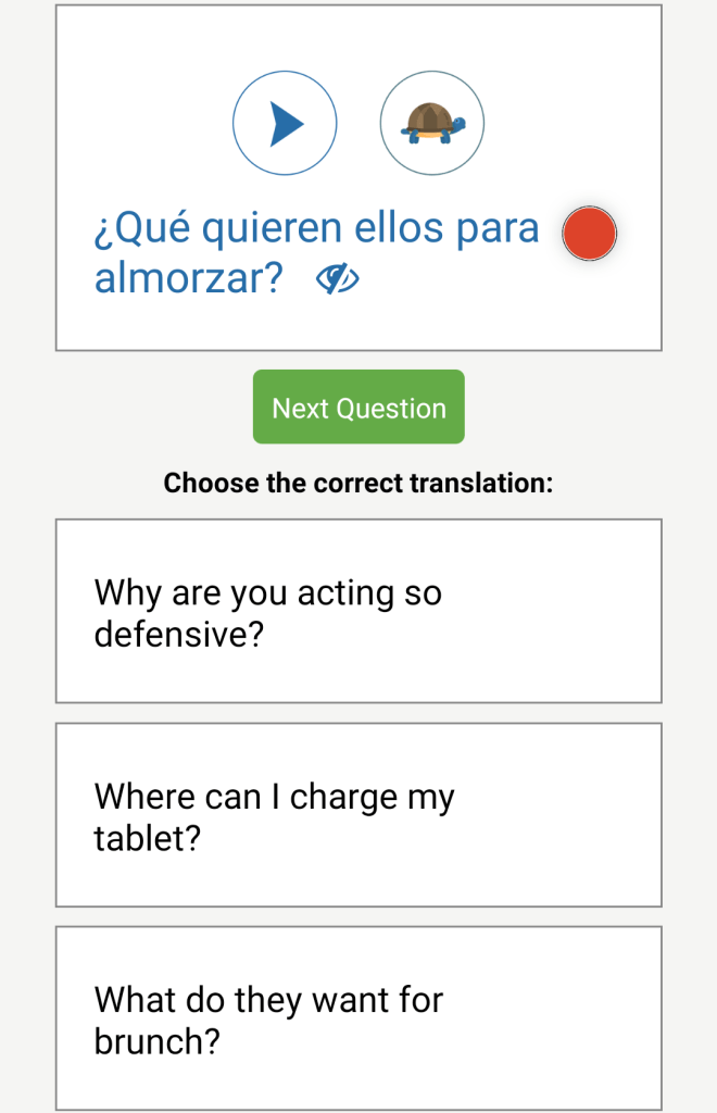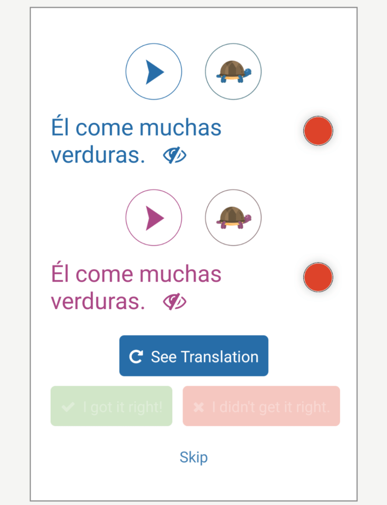 Switch over to this tab and you’ll get a Spanish audio (or whichever language you’re studying) followed by the translation. This helps you to make the connection in your mind between both statements.